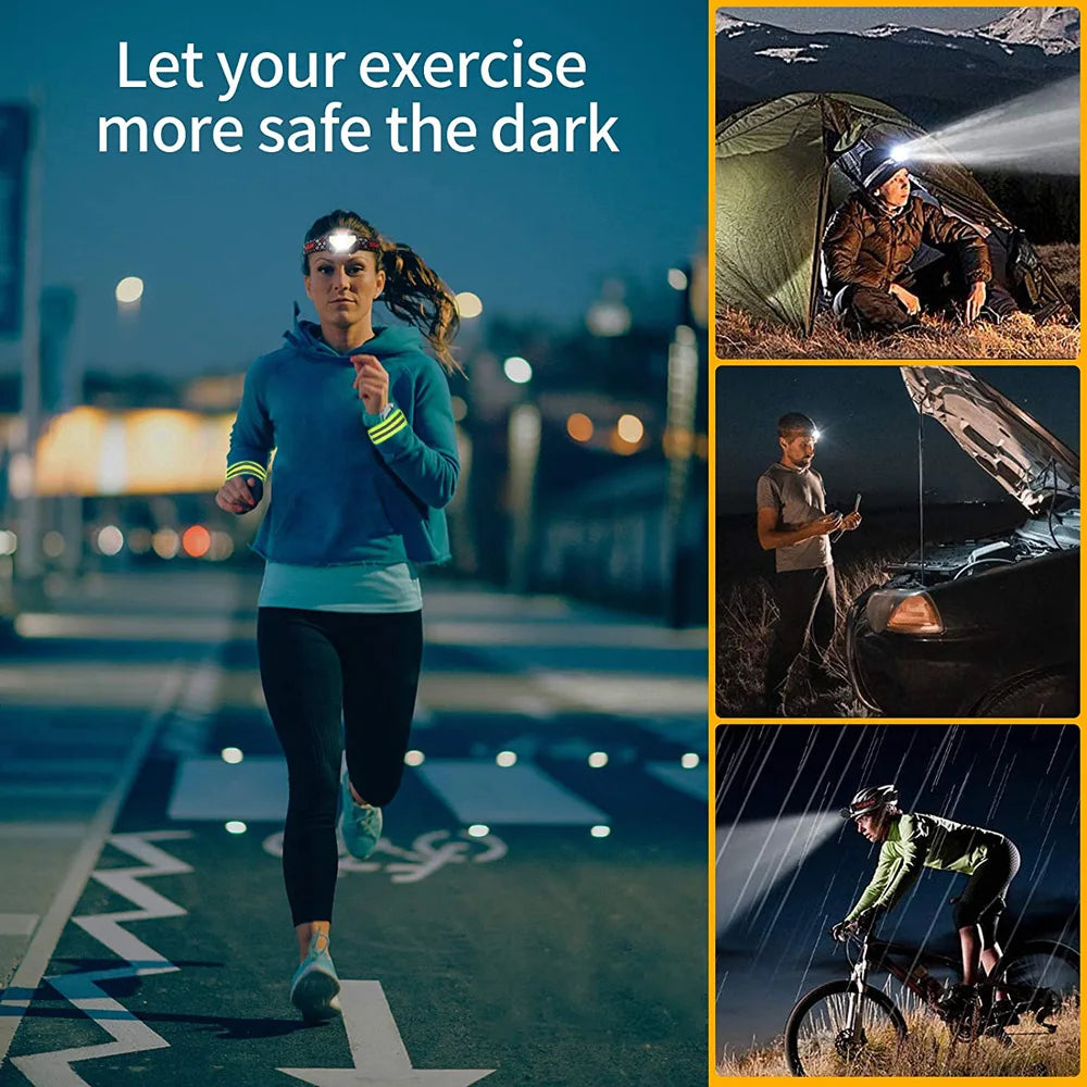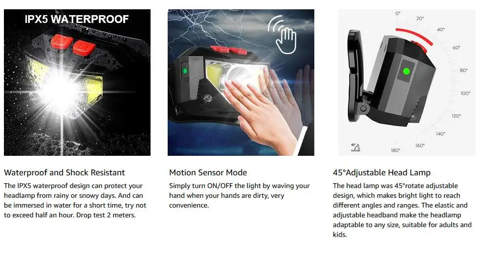 【8 MODES & MOTION SENSE FUNCTION】 - The 45 degree adjustable headlight gives you the freedom to direct light exactly where you need it. Quickly choose from 8 lighting modes. (LED BEAM: High, Medium. COB BEAM: High, Medium. RED LIGHT: HIGH, STROBE. SENSE MODE: HIGH, LOW.). Independent double switch design.